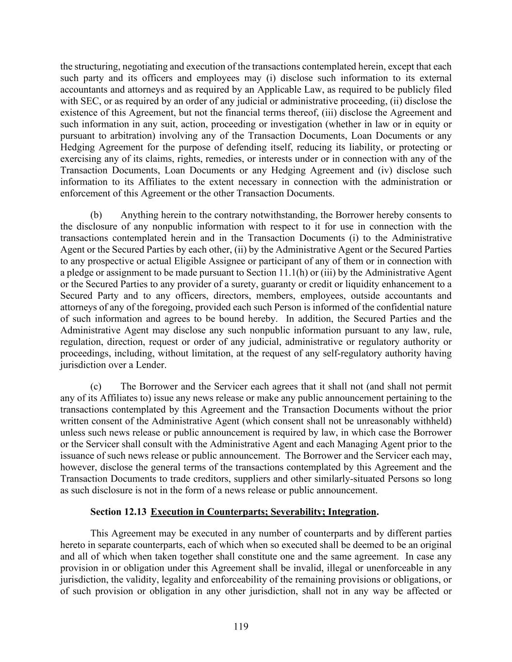 119 the structuring, negotiating and execution of the transactions contemplated herein, except that each such party and its officers and employees may (i) disclose such information to its external accountants and attorneys and as required by an Applicable Law, as required to be publicly filed with SEC, or as required by an order of any judicial or administrative proceeding, (ii) disclose the existence of this Agreement, but not the financial terms thereof, (iii) disclose the Agreement and such information in any suit, action, proceeding or investigation (whether in law or in equity or pursuant to arbitration) involving any of the Transaction Documents, Loan Documents or any Hedging Agreement for the purpose of defending itself, reducing its liability, or protecting or exercising any of its claims, rights, remedies, or interests under or in connection with any of the Transaction Documents, Loan Documents or any Hedging Agreement and (iv) disclose such information to its Affiliates to the extent necessary in connection with the administration or enforcement of this Agreement or the other Transaction Documents. (b) Anything herein to the contrary notwithstanding, the Borrower hereby consents to the disclosure of any nonpublic information with respect to it for use in connection with the transactions contemplated herein and in the Transaction Documents (i) to the Administrative Agent or the Secured Parties by each other, (ii) by the Administrative Agent or the Secured Parties to any prospective or actual Eligible Assignee or participant of any of them or in connection with a pledge or assignment to be made pursuant to Section 11.1(h) or (iii) by the Administrative Agent or the Secured Parties to any provider of a surety, guaranty or credit or liquidity enhancement to a Secured Party and to any officers, directors, members, employees, outside accountants and attorneys of any of the foregoing, provided each such Person is informed of the confidential nature of such information and agrees to be bound hereby. In addition, the Secured Parties and the Administrative Agent may disclose any such nonpublic information pursuant to any law, rule, regulation, direction, request or order of any judicial, administrative or regulatory authority or proceedings, including, without limitation, at the request of any self-regulatory authority having jurisdiction over a Lender. (c) The Borrower and the Servicer each agrees that it shall not (and shall not permit any of its Affiliates to) issue any news release or make any public announcement pertaining to the transactions contemplated by this Agreement and the Transaction Documents without the prior written consent of the Administrative Agent (which consent shall not be unreasonably withheld) unless such news release or public announcement is required by law, in which case the Borrower or the Servicer shall consult with the Administrative Agent and each Managing Agent prior to the issuance of such news release or public announcement. The Borrower and the Servicer each may, however, disclose the general terms of the transactions contemplated by this Agreement and the Transaction Documents to trade creditors, suppliers and other similarly-situated Persons so long as such disclosure is not in the form of a news release or public announcement. Section 12.13 Execution in Counterparts; Severability; Integration. This Agreement may be executed in any number of counterparts and by different parties hereto in separate counterparts, each of which when so executed shall be deemed to be an original and all of which when taken together shall constitute one and the same agreement. In case any provision in or obligation under this Agreement shall be invalid, illegal or unenforceable in any jurisdiction, the validity, legality and enforceability of the remaining provisions or obligations, or of such provision or obligation in any other jurisdiction, shall not in any way be affected or