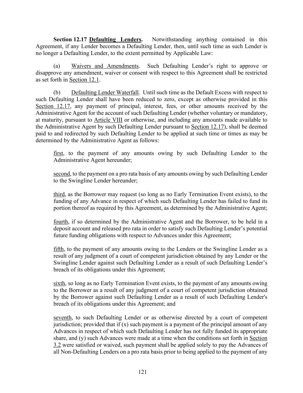 121 Section 12.17 Defaulting Lenders. Notwithstanding anything contained in this Agreement, if any Lender becomes a Defaulting Lender, then, until such time as such Lender is no longer a Defaulting Lender, to the extent permitted by Applicable Law: (a) Waivers and Amendments. Such Defaulting Lender’s right to approve or disapprove any amendment, waiver or consent with respect to this Agreement shall be restricted as set forth in Section 12.1. (b) Defaulting Lender Waterfall. Until such time as the Default Excess with respect to such Defaulting Lender shall have been reduced to zero, except as otherwise provided in this Section 12.17, any payment of principal, interest, fees, or other amounts received by the Administrative Agent for the account of such Defaulting Lender (whether voluntary or mandatory, at maturity, pursuant to Article VIII or otherwise, and including any amounts made available to the Administrative Agent by such Defaulting Lender pursuant to Section 12.17), shall be deemed paid to and redirected by such Defaulting Lender to be applied at such time or times as may be determined by the Administrative Agent as follows: first, to the payment of any amounts owing by such Defaulting Lender to the Administrative Agent hereunder; second, to the payment on a pro rata basis of any amounts owing by such Defaulting Lender to the Swingline Lender hereunder; third, as the Borrower may request (so long as no Early Termination Event exists), to the funding of any Advance in respect of which such Defaulting Lender has failed to fund its portion thereof as required by this Agreement, as determined by the Administrative Agent; fourth, if so determined by the Administrative Agent and the Borrower, to be held in a deposit account and released pro rata in order to satisfy such Defaulting Lender’s potential future funding obligations with respect to Advances under this Agreement; fifth, to the payment of any amounts owing to the Lenders or the Swingline Lender as a result of any judgment of a court of competent jurisdiction obtained by any Lender or the Swingline Lender against such Defaulting Lender as a result of such Defaulting Lender’s breach of its obligations under this Agreement; sixth, so long as no Early Termination Event exists, to the payment of any amounts owing to the Borrower as a result of any judgment of a court of competent jurisdiction obtained by the Borrower against such Defaulting Lender as a result of such Defaulting Lender's breach of its obligations under this Agreement; and seventh, to such Defaulting Lender or as otherwise directed by a court of competent jurisdiction; provided that if (x) such payment is a payment of the principal amount of any Advances in respect of which such Defaulting Lender has not fully funded its appropriate share, and (y) such Advances were made at a time when the conditions set forth in Section 3.2 were satisfied or waived, such payment shall be applied solely to pay the Advances of all Non-Defaulting Lenders on a pro rata basis prior to being applied to the payment of any
