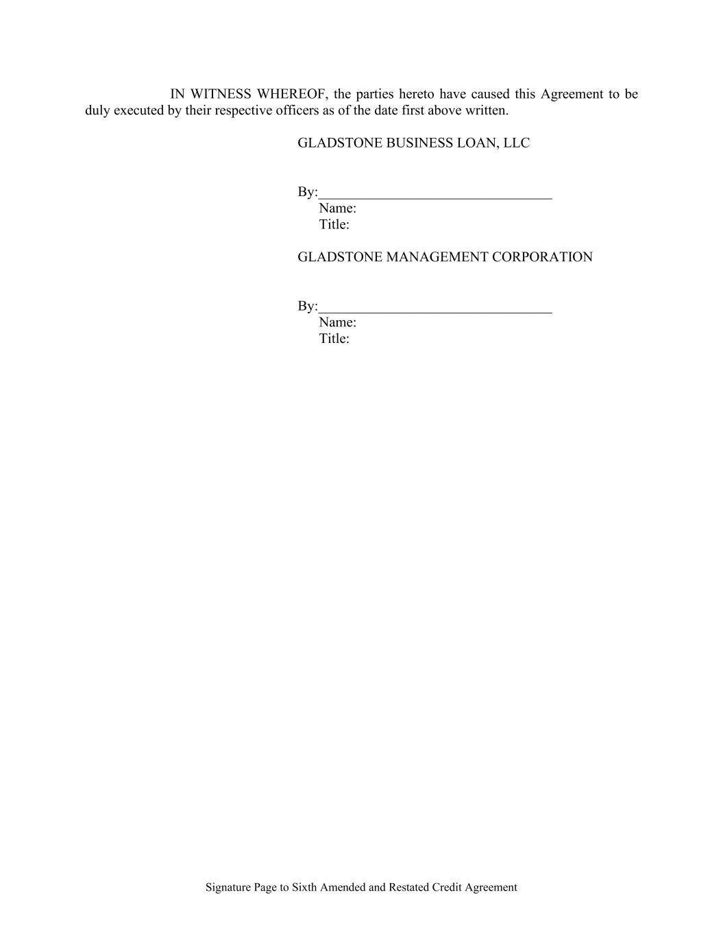 Signature Page to Sixth Amended and Restated Credit Agreement IN WITNESS WHEREOF, the parties hereto have caused this Agreement to be duly executed by their respective officers as of the date first above written. GLADSTONE BUSINESS LOAN, LLC By:_________________________________ Name: Title: GLADSTONE MANAGEMENT CORPORATION By:_________________________________ Name: Title: