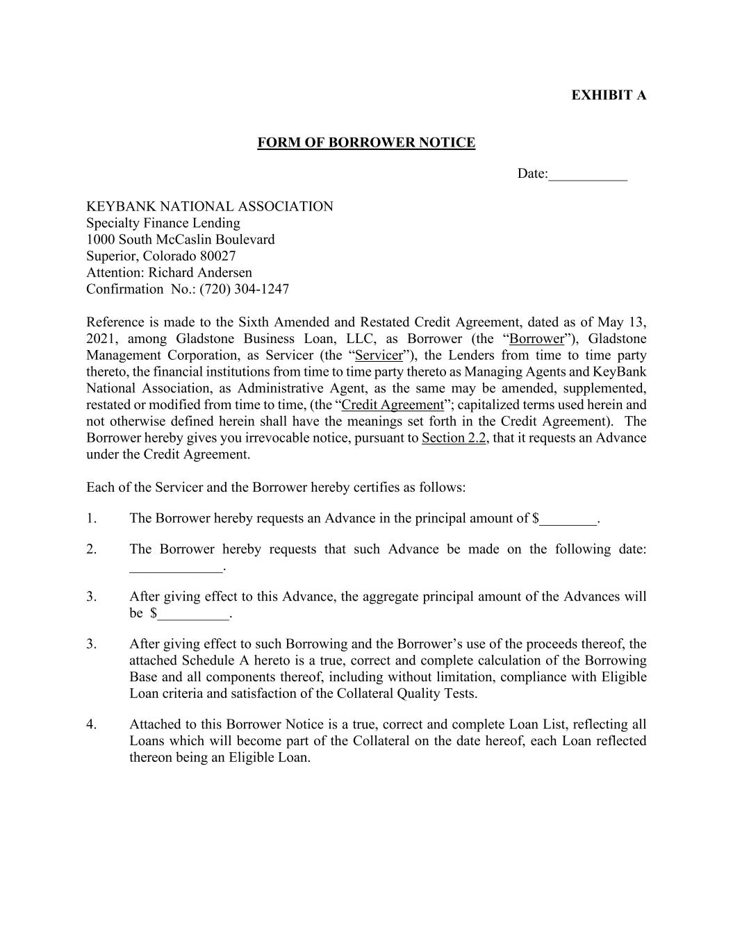 EXHIBIT A FORM OF BORROWER NOTICE Date:___________ KEYBANK NATIONAL ASSOCIATION Specialty Finance Lending 1000 South McCaslin Boulevard Superior, Colorado 80027 Attention: Richard Andersen Confirmation No.: (720) 304-1247 Reference is made to the Sixth Amended and Restated Credit Agreement, dated as of May 13, 2021, among Gladstone Business Loan, LLC, as Borrower (the “Borrower”), Gladstone Management Corporation, as Servicer (the “Servicer”), the Lenders from time to time party thereto, the financial institutions from time to time party thereto as Managing Agents and KeyBank National Association, as Administrative Agent, as the same may be amended, supplemented, restated or modified from time to time, (the “Credit Agreement”; capitalized terms used herein and not otherwise defined herein shall have the meanings set forth in the Credit Agreement). The Borrower hereby gives you irrevocable notice, pursuant to Section 2.2, that it requests an Advance under the Credit Agreement. Each of the Servicer and the Borrower hereby certifies as follows: 1. The Borrower hereby requests an Advance in the principal amount of $________. 2. The Borrower hereby requests that such Advance be made on the following date: _____________. 3. After giving effect to this Advance, the aggregate principal amount of the Advances will be $__________. 3. After giving effect to such Borrowing and the Borrower’s use of the proceeds thereof, the attached Schedule A hereto is a true, correct and complete calculation of the Borrowing Base and all components thereof, including without limitation, compliance with Eligible Loan criteria and satisfaction of the Collateral Quality Tests. 4. Attached to this Borrower Notice is a true, correct and complete Loan List, reflecting all Loans which will become part of the Collateral on the date hereof, each Loan reflected thereon being an Eligible Loan.