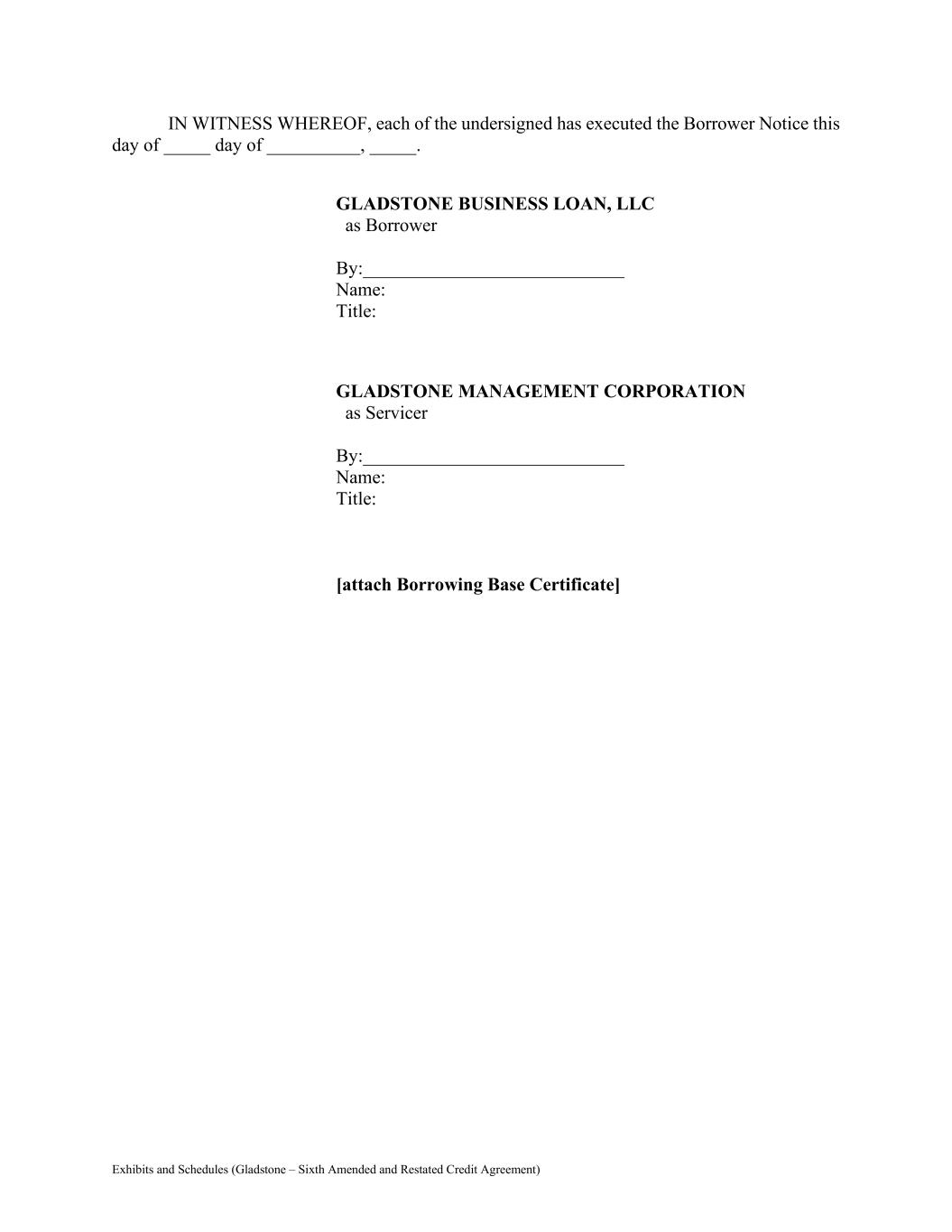 Exhibits and Schedules (Gladstone – Sixth Amended and Restated Credit Agreement) IN WITNESS WHEREOF, each of the undersigned has executed the Borrower Notice this day of _____ day of __________, _____. GLADSTONE BUSINESS LOAN, LLC as Borrower By:____________________________ Name: Title: GLADSTONE MANAGEMENT CORPORATION as Servicer By:____________________________ Name: Title: [attach Borrowing Base Certificate]
