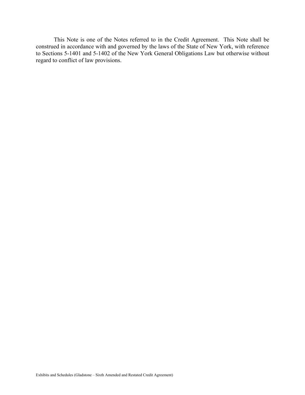 Exhibits and Schedules (Gladstone – Sixth Amended and Restated Credit Agreement) This Note is one of the Notes referred to in the Credit Agreement. This Note shall be construed in accordance with and governed by the laws of the State of New York, with reference to Sections 5-1401 and 5-1402 of the New York General Obligations Law but otherwise without regard to conflict of law provisions.