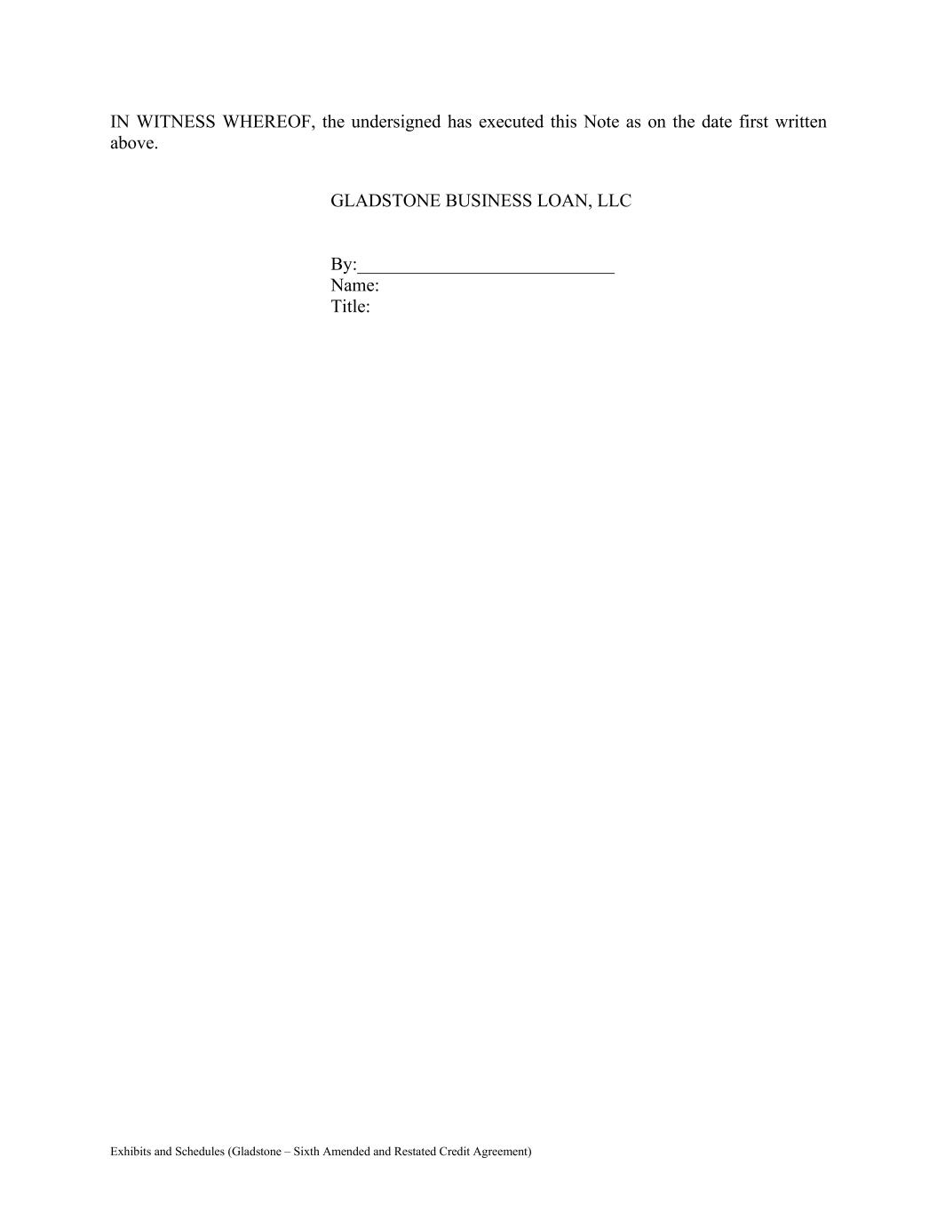 Exhibits and Schedules (Gladstone – Sixth Amended and Restated Credit Agreement) IN WITNESS WHEREOF, the undersigned has executed this Note as on the date first written above. GLADSTONE BUSINESS LOAN, LLC By:____________________________ Name: Title: