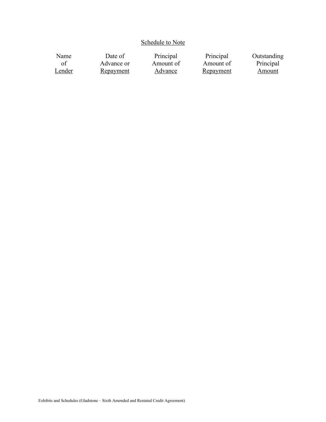Exhibits and Schedules (Gladstone – Sixth Amended and Restated Credit Agreement) Schedule to Note Name of Lender Date of Advance or Repayment Principal Amount of Advance Principal Amount of Repayment Outstanding Principal Amount