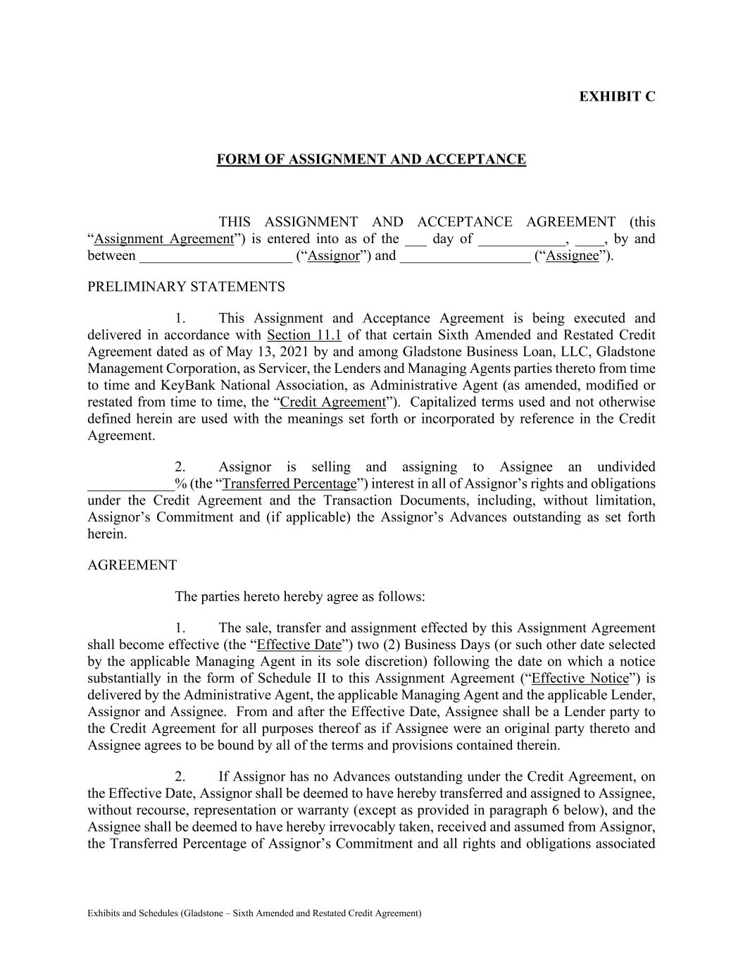 Exhibits and Schedules (Gladstone – Sixth Amended and Restated Credit Agreement) EXHIBIT C FORM OF ASSIGNMENT AND ACCEPTANCE THIS ASSIGNMENT AND ACCEPTANCE AGREEMENT (this “Assignment Agreement”) is entered into as of the ___ day of ____________, ____, by and between _____________________ (“Assignor”) and __________________ (“Assignee”). PRELIMINARY STATEMENTS 1. This Assignment and Acceptance Agreement is being executed and delivered in accordance with Section 11.1 of that certain Sixth Amended and Restated Credit Agreement dated as of May 13, 2021 by and among Gladstone Business Loan, LLC, Gladstone Management Corporation, as Servicer, the Lenders and Managing Agents parties thereto from time to time and KeyBank National Association, as Administrative Agent (as amended, modified or restated from time to time, the “Credit Agreement”). Capitalized terms used and not otherwise defined herein are used with the meanings set forth or incorporated by reference in the Credit Agreement. 2. Assignor is selling and assigning to Assignee an undivided ____________% (the “Transferred Percentage”) interest in all of Assignor’s rights and obligations under the Credit Agreement and the Transaction Documents, including, without limitation, Assignor’s Commitment and (if applicable) the Assignor’s Advances outstanding as set forth herein. AGREEMENT The parties hereto hereby agree as follows: 1. The sale, transfer and assignment effected by this Assignment Agreement shall become effective (the “Effective Date”) two (2) Business Days (or such other date selected by the applicable Managing Agent in its sole discretion) following the date on which a notice substantially in the form of Schedule II to this Assignment Agreement (“Effective Notice”) is delivered by the Administrative Agent, the applicable Managing Agent and the applicable Lender, Assignor and Assignee. From and after the Effective Date, Assignee shall be a Lender party to the Credit Agreement for all purposes thereof as if Assignee were an original party thereto and Assignee agrees to be bound by all of the terms and provisions contained therein. 2. If Assignor has no Advances outstanding under the Credit Agreement, on the Effective Date, Assignor shall be deemed to have hereby transferred and assigned to Assignee, without recourse, representation or warranty (except as provided in paragraph 6 below), and the Assignee shall be deemed to have hereby irrevocably taken, received and assumed from Assignor, the Transferred Percentage of Assignor’s Commitment and all rights and obligations associated