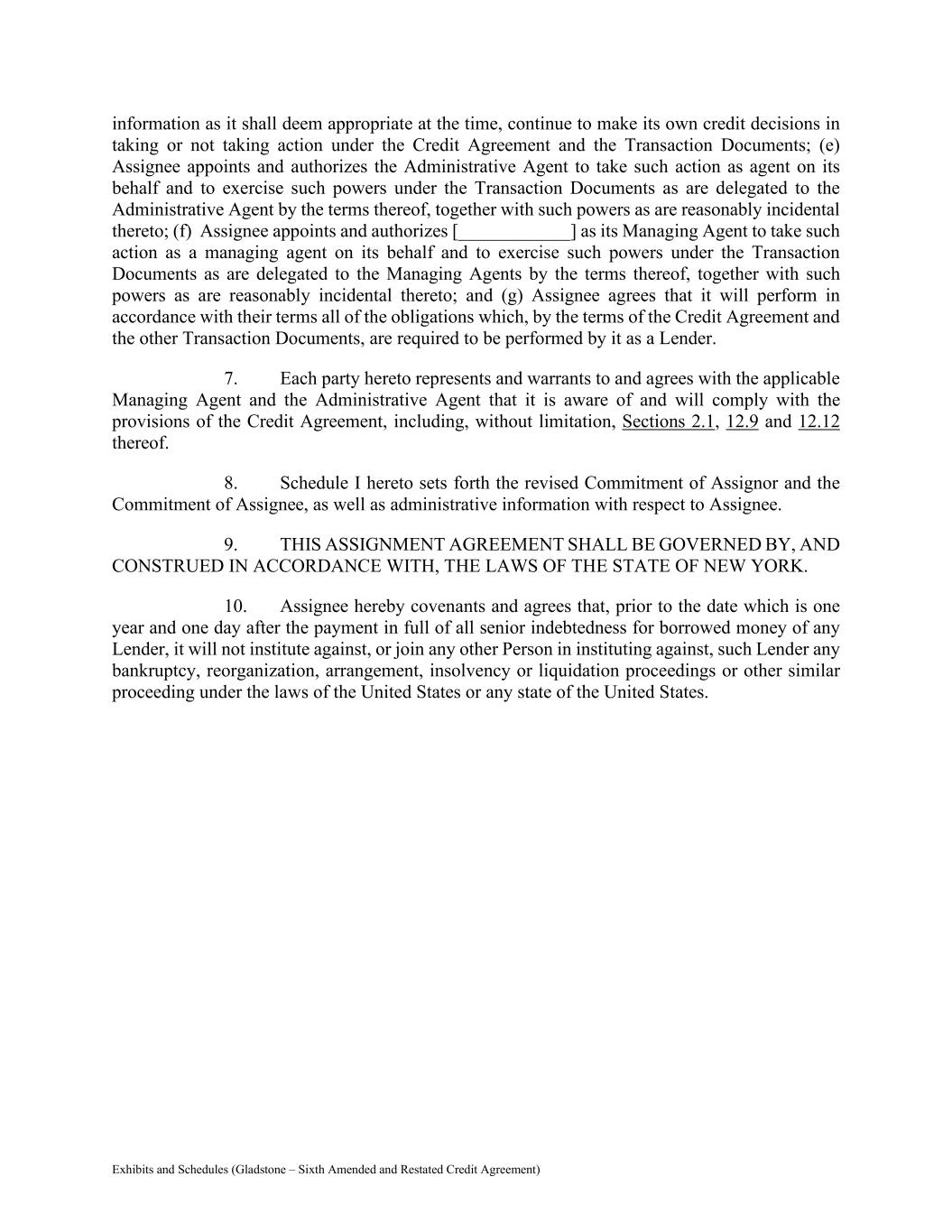 Exhibits and Schedules (Gladstone – Sixth Amended and Restated Credit Agreement) information as it shall deem appropriate at the time, continue to make its own credit decisions in taking or not taking action under the Credit Agreement and the Transaction Documents; (e) Assignee appoints and authorizes the Administrative Agent to take such action as agent on its behalf and to exercise such powers under the Transaction Documents as are delegated to the Administrative Agent by the terms thereof, together with such powers as are reasonably incidental thereto; (f) Assignee appoints and authorizes [____________] as its Managing Agent to take such action as a managing agent on its behalf and to exercise such powers under the Transaction Documents as are delegated to the Managing Agents by the terms thereof, together with such powers as are reasonably incidental thereto; and (g) Assignee agrees that it will perform in accordance with their terms all of the obligations which, by the terms of the Credit Agreement and the other Transaction Documents, are required to be performed by it as a Lender. 7. Each party hereto represents and warrants to and agrees with the applicable Managing Agent and the Administrative Agent that it is aware of and will comply with the provisions of the Credit Agreement, including, without limitation, Sections 2.1, 12.9 and 12.12 thereof. 8. Schedule I hereto sets forth the revised Commitment of Assignor and the Commitment of Assignee, as well as administrative information with respect to Assignee. 9. THIS ASSIGNMENT AGREEMENT SHALL BE GOVERNED BY, AND CONSTRUED IN ACCORDANCE WITH, THE LAWS OF THE STATE OF NEW YORK. 10. Assignee hereby covenants and agrees that, prior to the date which is one year and one day after the payment in full of all senior indebtedness for borrowed money of any Lender, it will not institute against, or join any other Person in instituting against, such Lender any bankruptcy, reorganization, arrangement, insolvency or liquidation proceedings or other similar proceeding under the laws of the United States or any state of the United States.