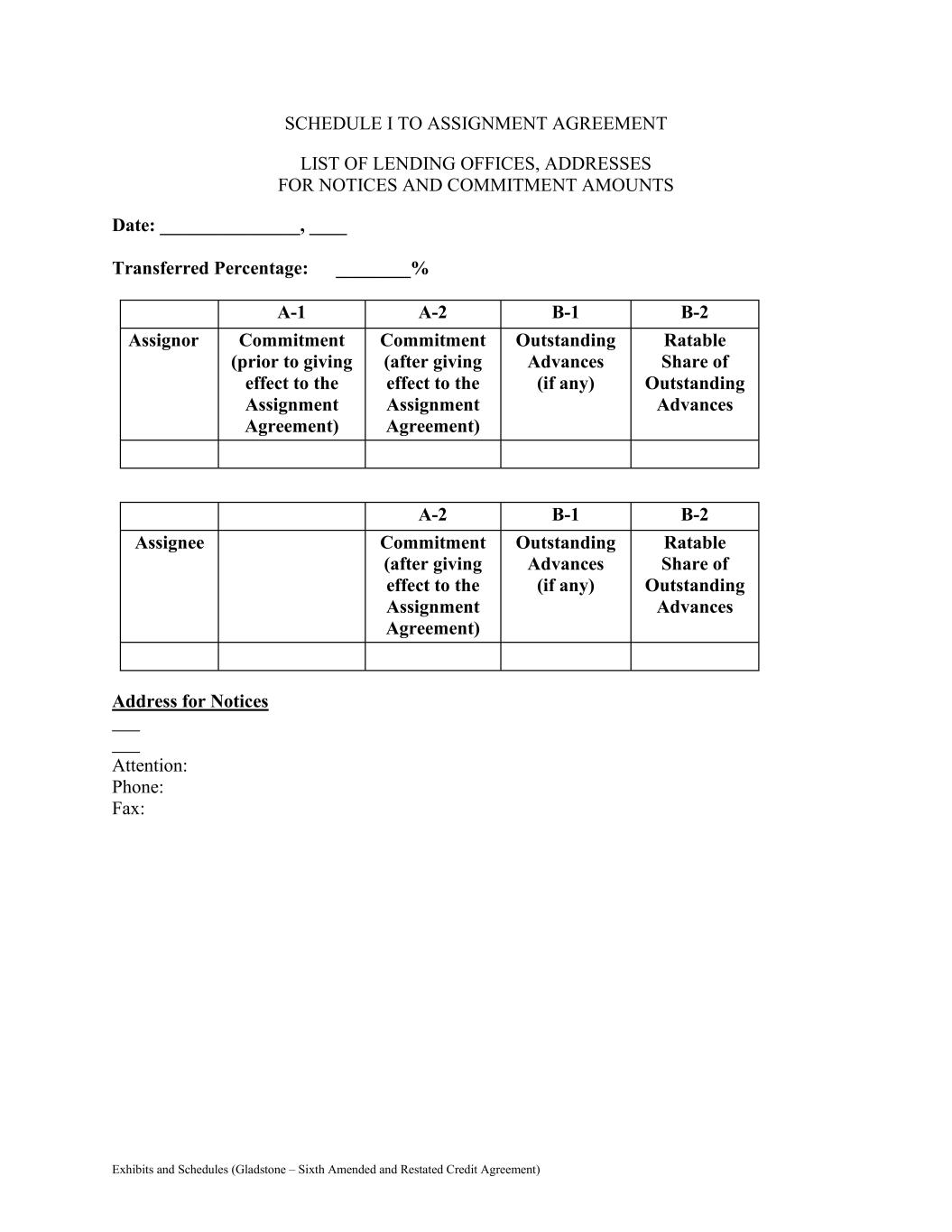 Exhibits and Schedules (Gladstone – Sixth Amended and Restated Credit Agreement) SCHEDULE I TO ASSIGNMENT AGREEMENT LIST OF LENDING OFFICES, ADDRESSES FOR NOTICES AND COMMITMENT AMOUNTS Date: _______________, ____ Transferred Percentage: ________% A-1 A-2 B-1 B-2 Assignor Commitment (prior to giving effect to the Assignment Agreement) Commitment (after giving effect to the Assignment Agreement) Outstanding Advances (if any) Ratable Share of Outstanding Advances A-2 B-1 B-2 Assignee Commitment (after giving effect to the Assignment Agreement) Outstanding Advances (if any) Ratable Share of Outstanding Advances Address for Notices Attention: Phone: Fax: