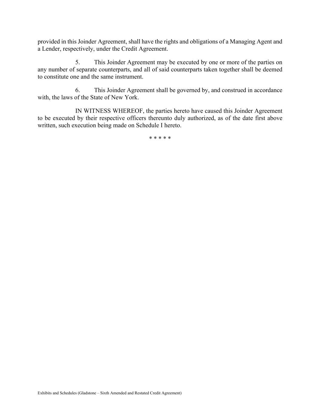 Exhibits and Schedules (Gladstone – Sixth Amended and Restated Credit Agreement) provided in this Joinder Agreement, shall have the rights and obligations of a Managing Agent and a Lender, respectively, under the Credit Agreement. 5. This Joinder Agreement may be executed by one or more of the parties on any number of separate counterparts, and all of said counterparts taken together shall be deemed to constitute one and the same instrument. 6. This Joinder Agreement shall be governed by, and construed in accordance with, the laws of the State of New York. IN WITNESS WHEREOF, the parties hereto have caused this Joinder Agreement to be executed by their respective officers thereunto duly authorized, as of the date first above written, such execution being made on Schedule I hereto. * * * * *