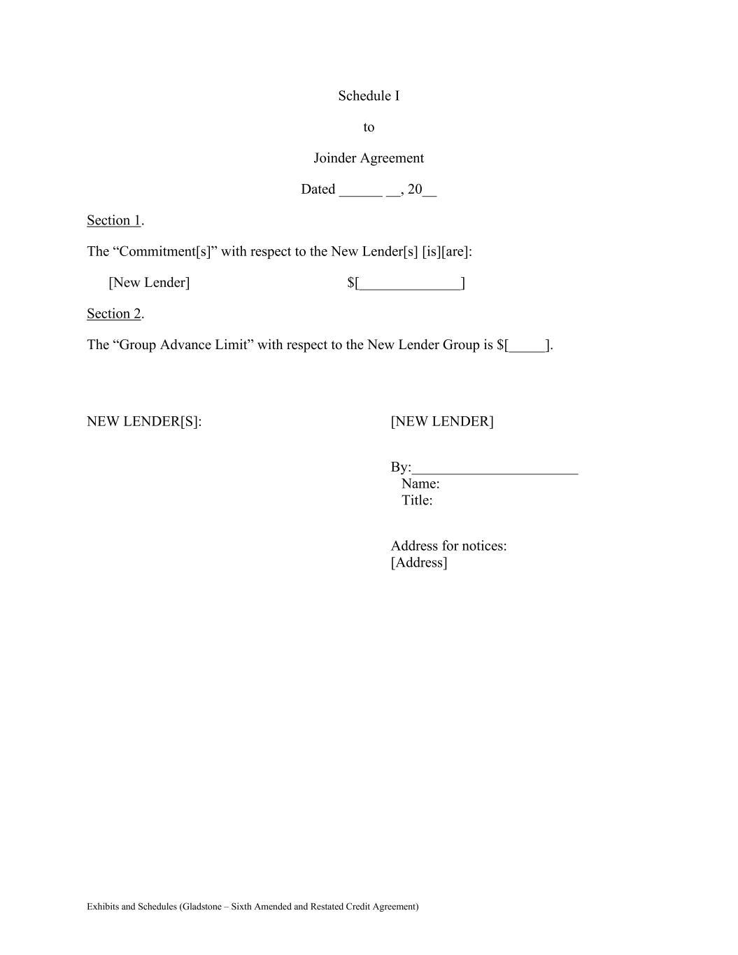 Exhibits and Schedules (Gladstone – Sixth Amended and Restated Credit Agreement) Schedule I to Joinder Agreement Dated ______ __, 20__ Section 1. The “Commitment[s]” with respect to the New Lender[s] [is][are]: [New Lender] $[______________] Section 2. The “Group Advance Limit” with respect to the New Lender Group is $[_____]. NEW LENDER[S]: [NEW LENDER] By:_______________________ Name: Title: Address for notices: [Address]