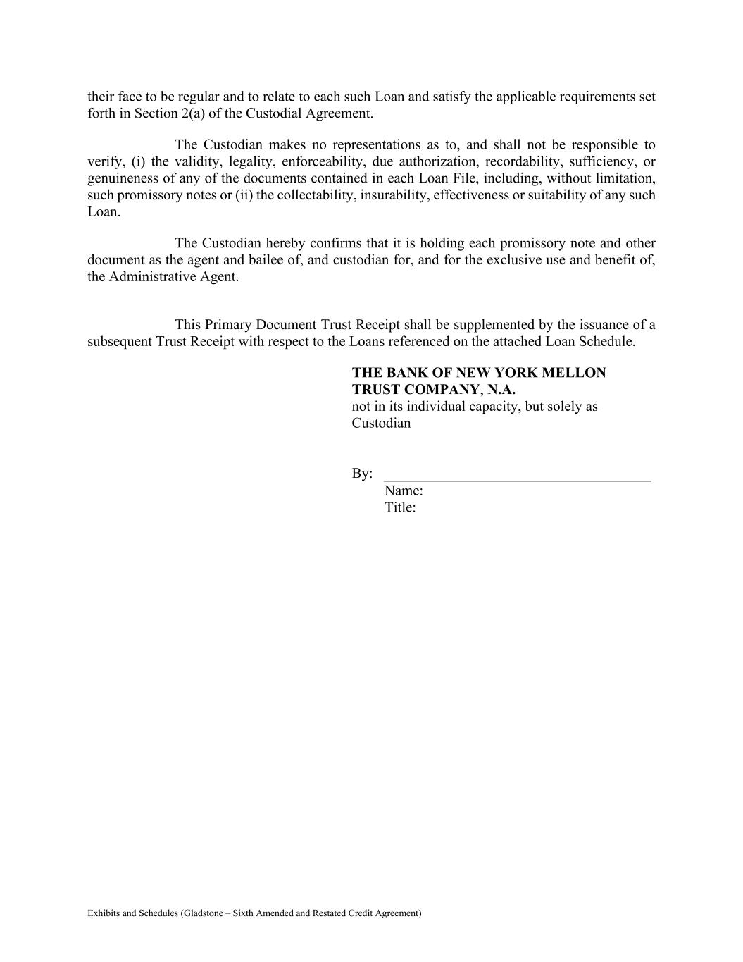 Exhibits and Schedules (Gladstone – Sixth Amended and Restated Credit Agreement) their face to be regular and to relate to each such Loan and satisfy the applicable requirements set forth in Section 2(a) of the Custodial Agreement. The Custodian makes no representations as to, and shall not be responsible to verify, (i) the validity, legality, enforceability, due authorization, recordability, sufficiency, or genuineness of any of the documents contained in each Loan File, including, without limitation, such promissory notes or (ii) the collectability, insurability, effectiveness or suitability of any such Loan. The Custodian hereby confirms that it is holding each promissory note and other document as the agent and bailee of, and custodian for, and for the exclusive use and benefit of, the Administrative Agent. This Primary Document Trust Receipt shall be supplemented by the issuance of a subsequent Trust Receipt with respect to the Loans referenced on the attached Loan Schedule. THE BANK OF NEW YORK MELLON TRUST COMPANY, N.A. not in its individual capacity, but solely as Custodian By: Name: Title: