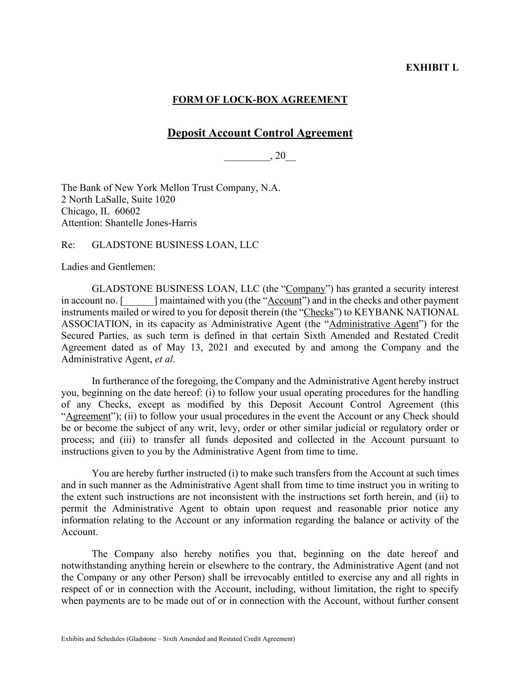 Exhibits and Schedules (Gladstone – Sixth Amended and Restated Credit Agreement) EXHIBIT L FORM OF LOCK-BOX AGREEMENT Deposit Account Control Agreement _________, 20__ The Bank of New York Mellon Trust Company, N.A. 2 North LaSalle, Suite 1020 Chicago, IL 60602 Attention: Shantelle Jones-Harris Re: GLADSTONE BUSINESS LOAN, LLC Ladies and Gentlemen: GLADSTONE BUSINESS LOAN, LLC (the “Company”) has granted a security interest in account no. [______] maintained with you (the “Account”) and in the checks and other payment instruments mailed or wired to you for deposit therein (the “Checks”) to KEYBANK NATIONAL ASSOCIATION, in its capacity as Administrative Agent (the “Administrative Agent”) for the Secured Parties, as such term is defined in that certain Sixth Amended and Restated Credit Agreement dated as of May 13, 2021 and executed by and among the Company and the Administrative Agent, et al. In furtherance of the foregoing, the Company and the Administrative Agent hereby instruct you, beginning on the date hereof: (i) to follow your usual operating procedures for the handling of any Checks, except as modified by this Deposit Account Control Agreement (this “Agreement”); (ii) to follow your usual procedures in the event the Account or any Check should be or become the subject of any writ, levy, order or other similar judicial or regulatory order or process; and (iii) to transfer all funds deposited and collected in the Account pursuant to instructions given to you by the Administrative Agent from time to time. You are hereby further instructed (i) to make such transfers from the Account at such times and in such manner as the Administrative Agent shall from time to time instruct you in writing to the extent such instructions are not inconsistent with the instructions set forth herein, and (ii) to permit the Administrative Agent to obtain upon request and reasonable prior notice any information relating to the Account or any information regarding the balance or activity of the Account. The Company also hereby notifies you that, beginning on the date hereof and notwithstanding anything herein or elsewhere to the contrary, the Administrative Agent (and not the Company or any other Person) shall be irrevocably entitled to exercise any and all rights in respect of or in connection with the Account, including, without limitation, the right to specify when payments are to be made out of or in connection with the Account, without further consent