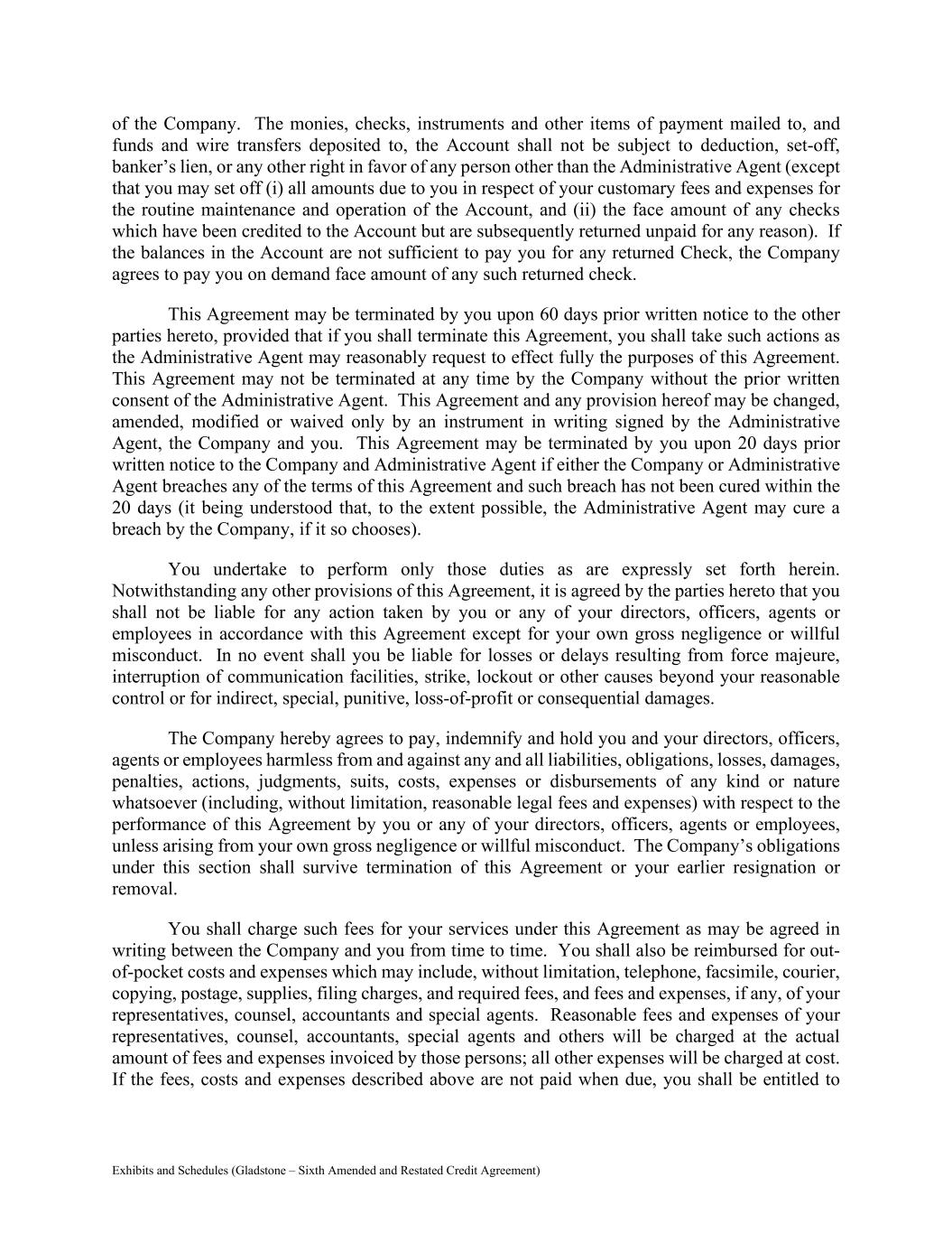 Exhibits and Schedules (Gladstone – Sixth Amended and Restated Credit Agreement) of the Company. The monies, checks, instruments and other items of payment mailed to, and funds and wire transfers deposited to, the Account shall not be subject to deduction, set-off, banker’s lien, or any other right in favor of any person other than the Administrative Agent (except that you may set off (i) all amounts due to you in respect of your customary fees and expenses for the routine maintenance and operation of the Account, and (ii) the face amount of any checks which have been credited to the Account but are subsequently returned unpaid for any reason). If the balances in the Account are not sufficient to pay you for any returned Check, the Company agrees to pay you on demand face amount of any such returned check. This Agreement may be terminated by you upon 60 days prior written notice to the other parties hereto, provided that if you shall terminate this Agreement, you shall take such actions as the Administrative Agent may reasonably request to effect fully the purposes of this Agreement. This Agreement may not be terminated at any time by the Company without the prior written consent of the Administrative Agent. This Agreement and any provision hereof may be changed, amended, modified or waived only by an instrument in writing signed by the Administrative Agent, the Company and you. This Agreement may be terminated by you upon 20 days prior written notice to the Company and Administrative Agent if either the Company or Administrative Agent breaches any of the terms of this Agreement and such breach has not been cured within the 20 days (it being understood that, to the extent possible, the Administrative Agent may cure a breach by the Company, if it so chooses). You undertake to perform only those duties as are expressly set forth herein. Notwithstanding any other provisions of this Agreement, it is agreed by the parties hereto that you shall not be liable for any action taken by you or any of your directors, officers, agents or employees in accordance with this Agreement except for your own gross negligence or willful misconduct. In no event shall you be liable for losses or delays resulting from force majeure, interruption of communication facilities, strike, lockout or other causes beyond your reasonable control or for indirect, special, punitive, loss-of-profit or consequential damages. The Company hereby agrees to pay, indemnify and hold you and your directors, officers, agents or employees harmless from and against any and all liabilities, obligations, losses, damages, penalties, actions, judgments, suits, costs, expenses or disbursements of any kind or nature whatsoever (including, without limitation, reasonable legal fees and expenses) with respect to the performance of this Agreement by you or any of your directors, officers, agents or employees, unless arising from your own gross negligence or willful misconduct. The Company’s obligations under this section shall survive termination of this Agreement or your earlier resignation or removal. You shall charge such fees for your services under this Agreement as may be agreed in writing between the Company and you from time to time. You shall also be reimbursed for out- of-pocket costs and expenses which may include, without limitation, telephone, facsimile, courier, copying, postage, supplies, filing charges, and required fees, and fees and expenses, if any, of your representatives, counsel, accountants and special agents. Reasonable fees and expenses of your representatives, counsel, accountants, special agents and others will be charged at the actual amount of fees and expenses invoiced by those persons; all other expenses will be charged at cost. If the fees, costs and expenses described above are not paid when due, you shall be entitled to