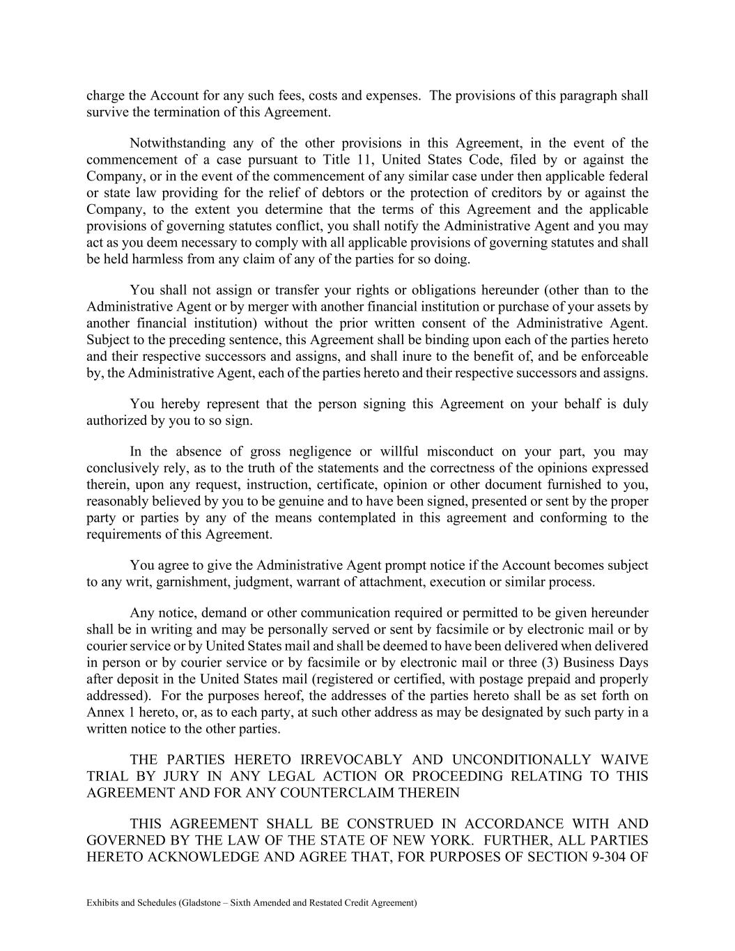 Exhibits and Schedules (Gladstone – Sixth Amended and Restated Credit Agreement) charge the Account for any such fees, costs and expenses. The provisions of this paragraph shall survive the termination of this Agreement. Notwithstanding any of the other provisions in this Agreement, in the event of the commencement of a case pursuant to Title 11, United States Code, filed by or against the Company, or in the event of the commencement of any similar case under then applicable federal or state law providing for the relief of debtors or the protection of creditors by or against the Company, to the extent you determine that the terms of this Agreement and the applicable provisions of governing statutes conflict, you shall notify the Administrative Agent and you may act as you deem necessary to comply with all applicable provisions of governing statutes and shall be held harmless from any claim of any of the parties for so doing. You shall not assign or transfer your rights or obligations hereunder (other than to the Administrative Agent or by merger with another financial institution or purchase of your assets by another financial institution) without the prior written consent of the Administrative Agent. Subject to the preceding sentence, this Agreement shall be binding upon each of the parties hereto and their respective successors and assigns, and shall inure to the benefit of, and be enforceable by, the Administrative Agent, each of the parties hereto and their respective successors and assigns. You hereby represent that the person signing this Agreement on your behalf is duly authorized by you to so sign. In the absence of gross negligence or willful misconduct on your part, you may conclusively rely, as to the truth of the statements and the correctness of the opinions expressed therein, upon any request, instruction, certificate, opinion or other document furnished to you, reasonably believed by you to be genuine and to have been signed, presented or sent by the proper party or parties by any of the means contemplated in this agreement and conforming to the requirements of this Agreement. You agree to give the Administrative Agent prompt notice if the Account becomes subject to any writ, garnishment, judgment, warrant of attachment, execution or similar process. Any notice, demand or other communication required or permitted to be given hereunder shall be in writing and may be personally served or sent by facsimile or by electronic mail or by courier service or by United States mail and shall be deemed to have been delivered when delivered in person or by courier service or by facsimile or by electronic mail or three (3) Business Days after deposit in the United States mail (registered or certified, with postage prepaid and properly addressed). For the purposes hereof, the addresses of the parties hereto shall be as set forth on Annex 1 hereto, or, as to each party, at such other address as may be designated by such party in a written notice to the other parties. THE PARTIES HERETO IRREVOCABLY AND UNCONDITIONALLY WAIVE TRIAL BY JURY IN ANY LEGAL ACTION OR PROCEEDING RELATING TO THIS AGREEMENT AND FOR ANY COUNTERCLAIM THEREIN THIS AGREEMENT SHALL BE CONSTRUED IN ACCORDANCE WITH AND GOVERNED BY THE LAW OF THE STATE OF NEW YORK. FURTHER, ALL PARTIES HERETO ACKNOWLEDGE AND AGREE THAT, FOR PURPOSES OF SECTION 9-304 OF