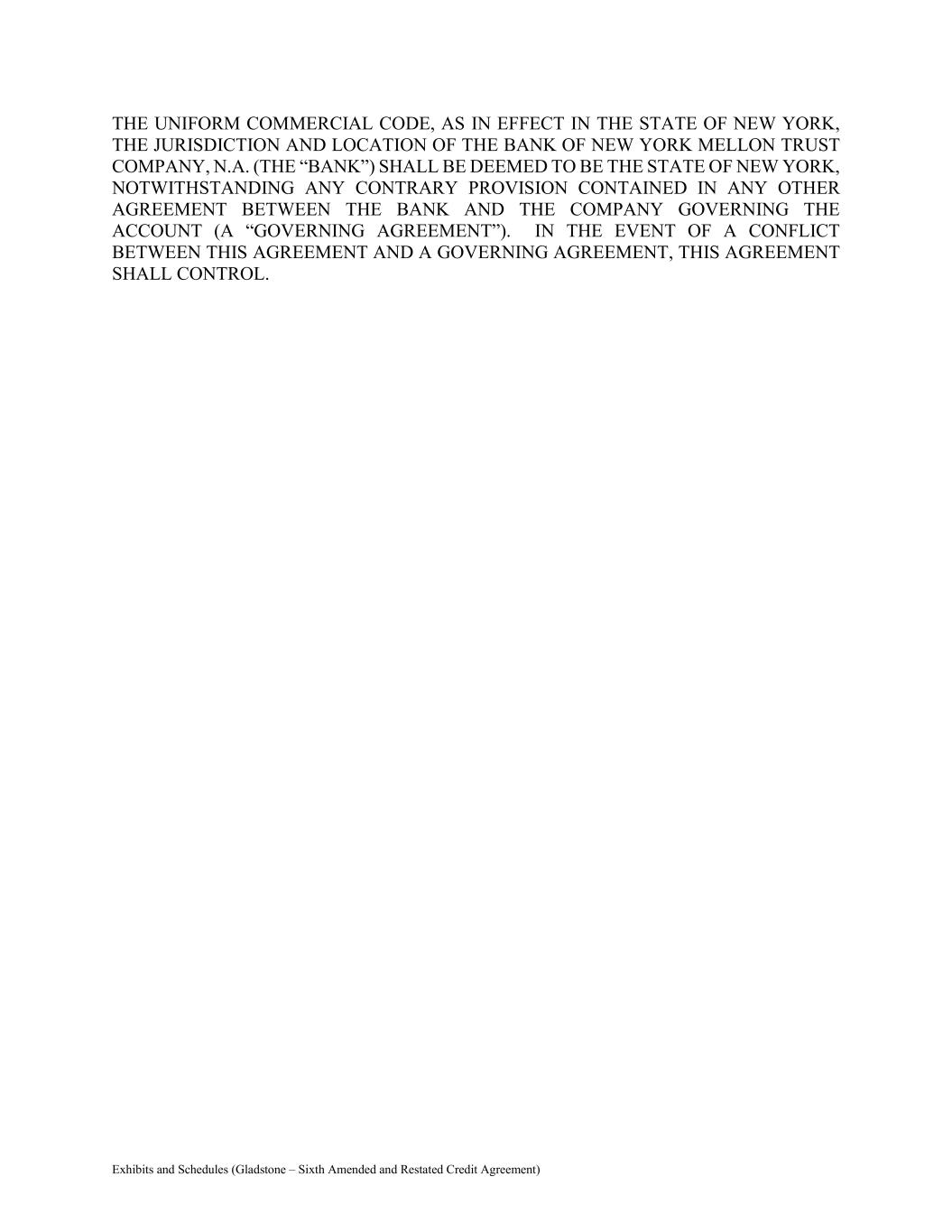 Exhibits and Schedules (Gladstone – Sixth Amended and Restated Credit Agreement) THE UNIFORM COMMERCIAL CODE, AS IN EFFECT IN THE STATE OF NEW YORK, THE JURISDICTION AND LOCATION OF THE BANK OF NEW YORK MELLON TRUST COMPANY, N.A. (THE “BANK”) SHALL BE DEEMED TO BE THE STATE OF NEW YORK, NOTWITHSTANDING ANY CONTRARY PROVISION CONTAINED IN ANY OTHER AGREEMENT BETWEEN THE BANK AND THE COMPANY GOVERNING THE ACCOUNT (A “GOVERNING AGREEMENT”). IN THE EVENT OF A CONFLICT BETWEEN THIS AGREEMENT AND A GOVERNING AGREEMENT, THIS AGREEMENT SHALL CONTROL.