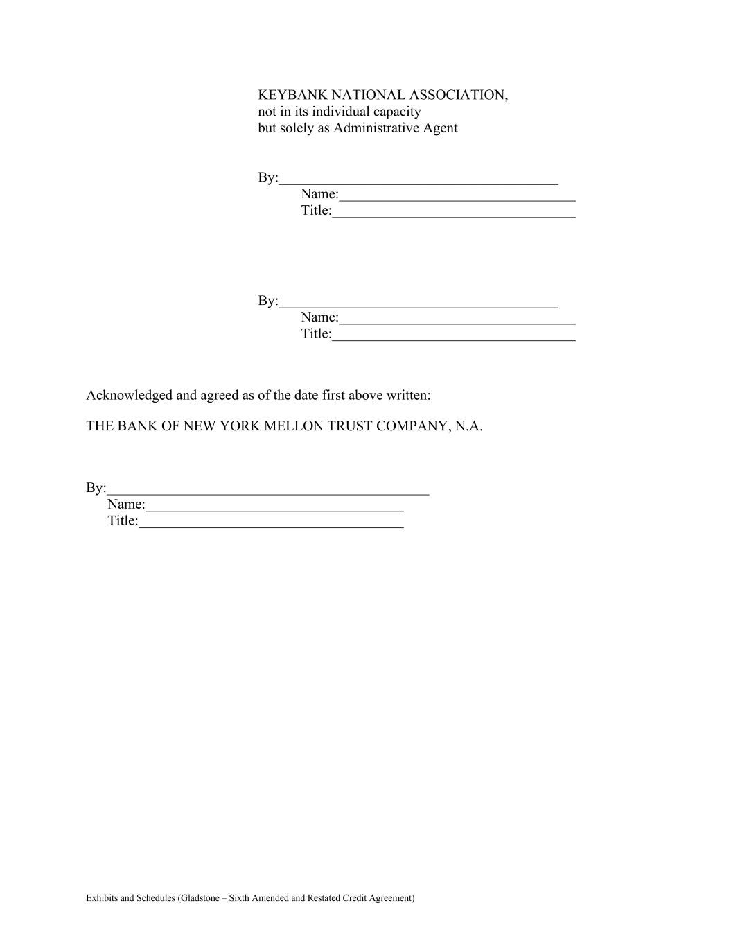 Exhibits and Schedules (Gladstone – Sixth Amended and Restated Credit Agreement) KEYBANK NATIONAL ASSOCIATION, not in its individual capacity but solely as Administrative Agent By:_______________________________________ Name:_________________________________ Title:__________________________________ By:_______________________________________ Name:_________________________________ Title:__________________________________ Acknowledged and agreed as of the date first above written: THE BANK OF NEW YORK MELLON TRUST COMPANY, N.A. By:_____________________________________________ Name:____________________________________ Title:_____________________________________