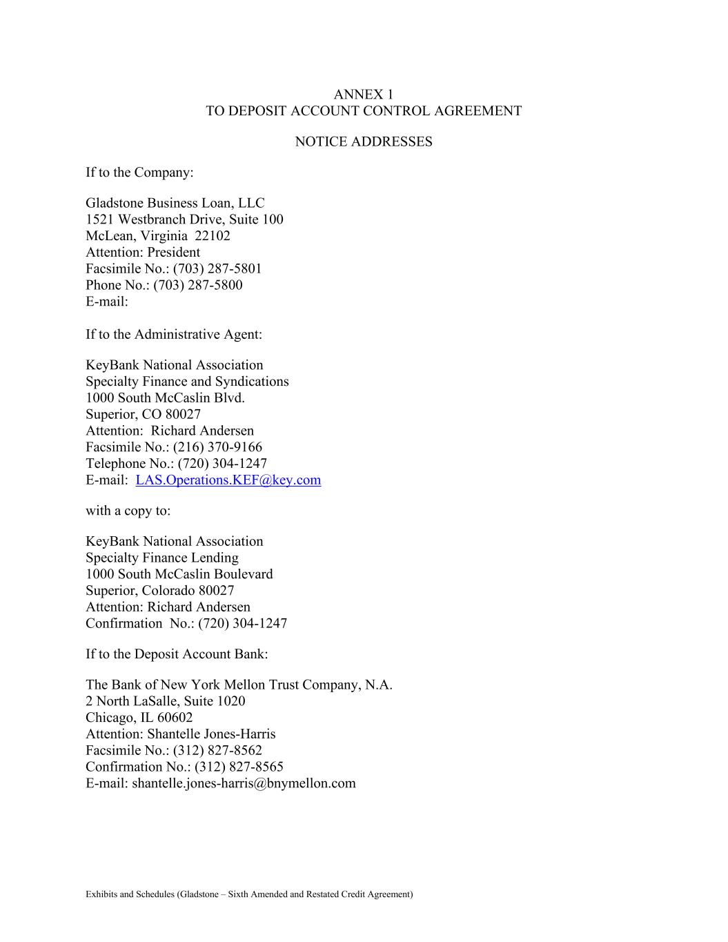 Exhibits and Schedules (Gladstone – Sixth Amended and Restated Credit Agreement) ANNEX 1 TO DEPOSIT ACCOUNT CONTROL AGREEMENT NOTICE ADDRESSES If to the Company: Gladstone Business Loan, LLC 1521 Westbranch Drive, Suite 100 McLean, Virginia 22102 Attention: President Facsimile No.: (703) 287-5801 Phone No.: (703) 287-5800 E-mail: If to the Administrative Agent: KeyBank National Association Specialty Finance and Syndications 1000 South McCaslin Blvd. Superior, CO 80027 Attention: Richard Andersen Facsimile No.: (216) 370-9166 Telephone No.: (720) 304-1247 E-mail: LAS.Operations.KEF@key.com with a copy to: KeyBank National Association Specialty Finance Lending 1000 South McCaslin Boulevard Superior, Colorado 80027 Attention: Richard Andersen Confirmation No.: (720) 304-1247 If to the Deposit Account Bank: The Bank of New York Mellon Trust Company, N.A. 2 North LaSalle, Suite 1020 Chicago, IL 60602 Attention: Shantelle Jones-Harris Facsimile No.: (312) 827-8562 Confirmation No.: (312) 827-8565 E-mail: shantelle.jones-harris@bnymellon.com