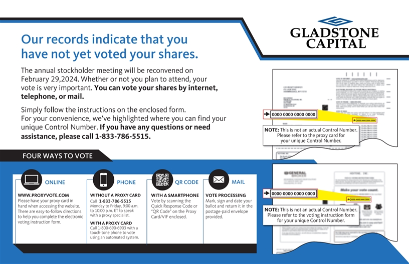 Our records indicate that you have not yet voted your shares. The annual stockholder meeting will be reconvened on February 29,2024. Whether or not you plan to attend, your vote is very important. You can vote your shares by internet, telephone, or mail. Simply follow the instructions on the enclosed form. 0000 0000 0000 0000 For your convenience, we’ve highlighted where you can find your 0000 0000 0000 0000 unique Control Number. If you have any questions or need NOTE: This is not an actual Control Number. Please refer to the proxy card for assistance, please call 1-833-786-5515. your unique Control Number. FOUR WAYS TO VOTE ONLINE PHONE QR CODE MAIL 0000 0000 0000 0000 WWW.PROXYVOTE.COM WITHOUT A PROXY CARD WITH A SMARTPHONE VOTE PROCESSING 0000 0000 0000 0000 Please have your proxy card in Call 1-833-786-5515 Vote by scanning the Mark, sign and date your hand when accessing the website. Monday to Friday, 9:00 a.m. Quick Response Code or ballot and return it in the NOTE: This is not an actual Control Number. to 10:00 p.m. ET to speak There are easy-to-follow directions “QR Code” on the Proxy postage-paid envelope with a proxy specialist. Please refer to the voting instruction form to help you complete the electronic Card/VIF enclosed. provided. for your unique Control Number. voting instruction form. WITH A PROXY CARD Call 1-800-690-6903 with a touch-tone phone to vote using an automated system.